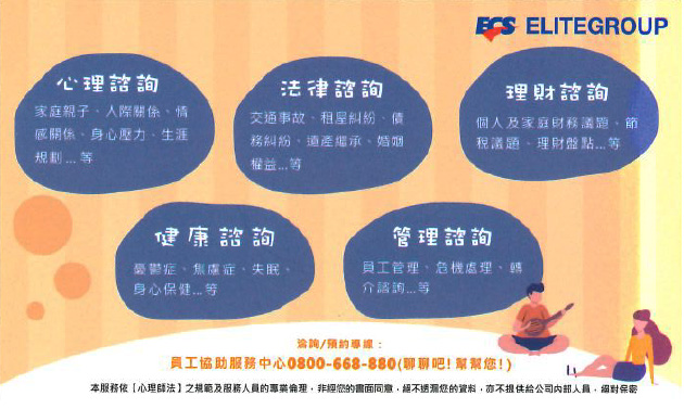 另精英電腦亦透過電子報、視訊及內部學習網站宣導各種醫療衛生、健康飲食及疾病防治新知,強化員工健康觀念。目前相關健康促進服務,包含員工年度健康檢查、健康體重管理計畫、運動季社團推廣、健康促進講座與課程。