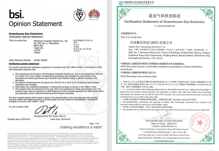 近年來全球暖化造成氣候異常,溫室氣體排放控制,成為世界關注的議題。為了拯救人類生存的環境,精英電腦於 2008 年導入 ,總公司及興英廠區順利取得基準年 2007 年盤查查證證書,並統計興英廠區 CO2e 排放量及產品生產量,並作為減碳作業的計算準則依據。