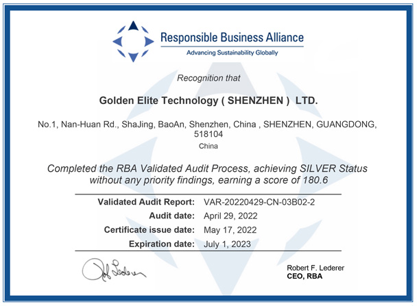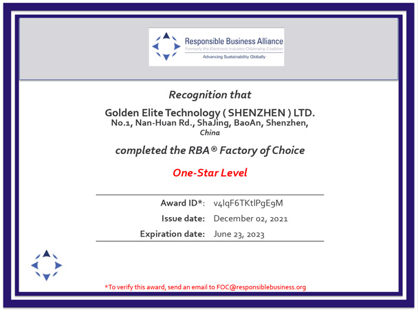 精英電腦自從 2006 年起,因應客戶需求及國際趨勢,於各廠區成立工作小組,進行推動電子行業行為規範 (Electronic Industry Code of Conduct,EICC) 現為責任商業聯盟行為準則 (Code of Conduct -Responsible Business Alliance,RBA),進行追蹤改善稽核中各項缺失,確保工作環境安全無虞、員工權 益受到保障與尊重、製程與產品落實污染預防,及善盡社會責任。興英廠區於 2018、2020、2021 年完成 RBA 外部有效性稽核程序(Validated Audit Process,VAP),達到 ,肯定積極改善各項稽核發現、對社會與環境責任予以承諾的企業。透過 RBA VAP 認可計劃,得以識別與鼓勵對於社會責任追求卓越的企業。2021 年更進一步取得 。